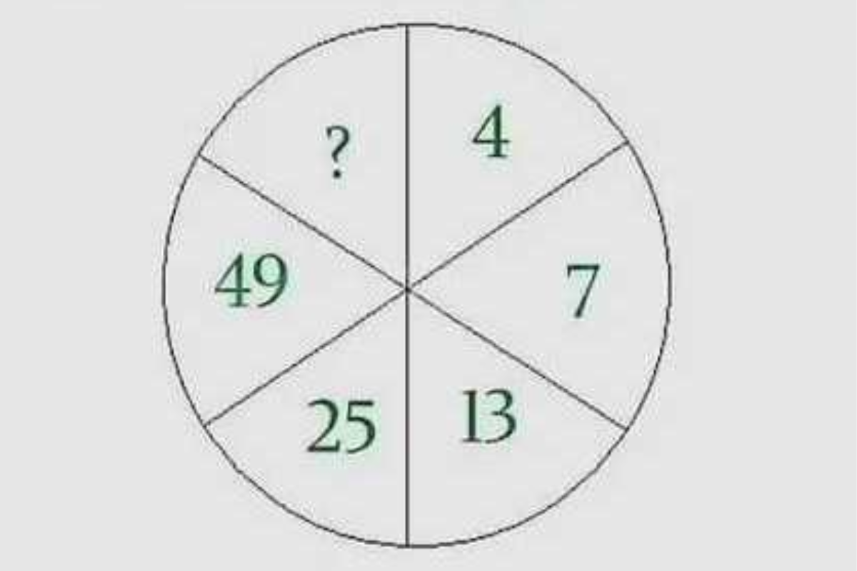 A imagem apresenta um círculo dividido em seis partes iguais, cada uma contendo um número. Cinco dessas partes estão preenchidas com os números 4, 7, 13, 25 e 49, enquanto uma seção está vazia, indicando que falta um número. O desafio é descobrir qual número deve preencher esse espaço vazio com base no padrão da sequência.