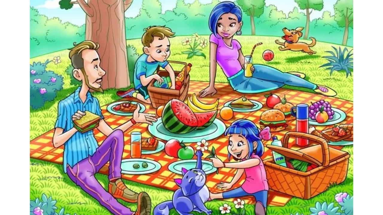 Sanduíches, frutas frescas e guloseimas se espalham diante deles, criando um verdadeiro banquete de piquenique. Porém, o desafio aqui não é apenas apreciar a serenidade deste cenário campestre, mas também detectar um elemento peculiar nesta imagem.