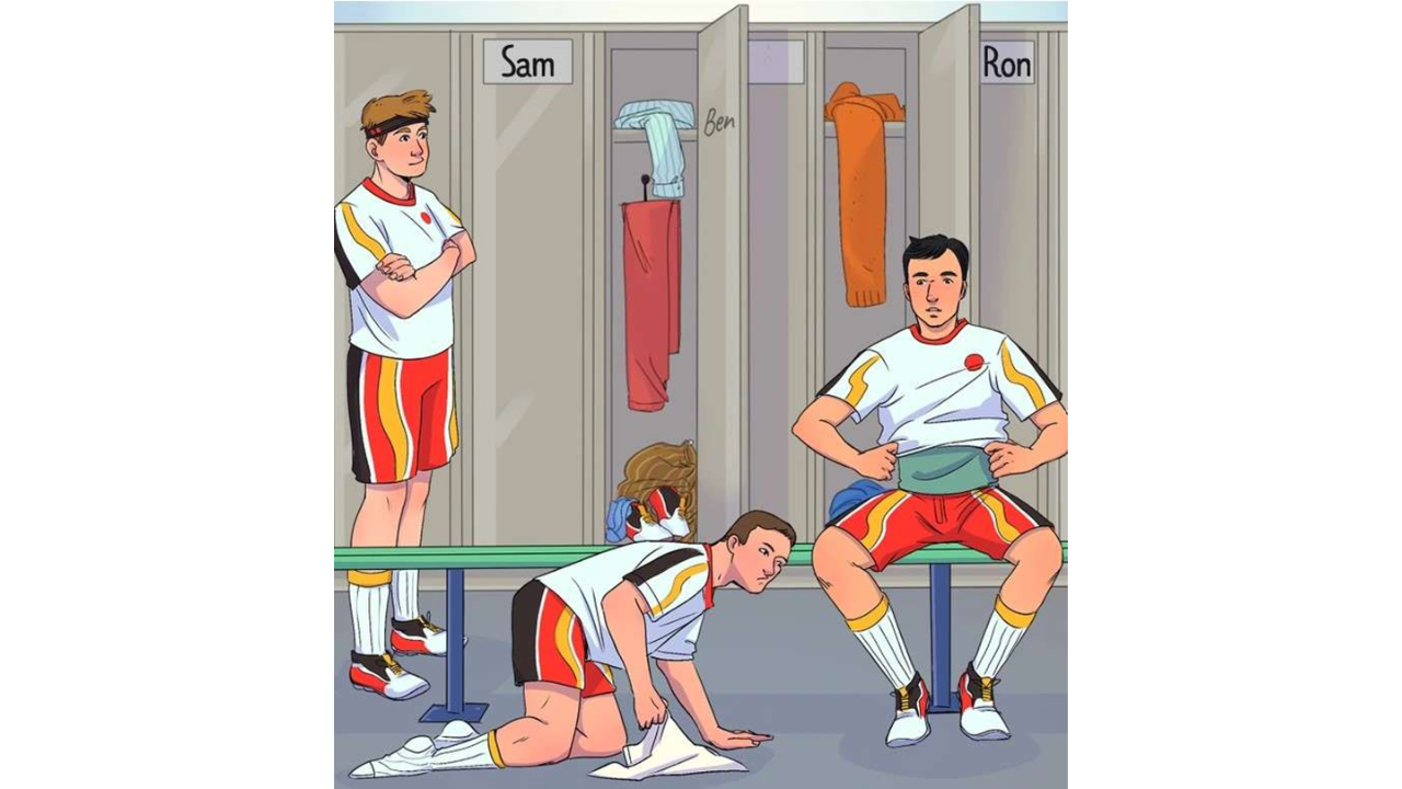 Há um toque de mistério neste quebra-cabeça. Dentro do vestiário, você encontrará três armários, cada um deles com um nome claramente identificado: Sam, Ben e Ron. Agora, a pergunta é direta: “Quem é Ben?”.