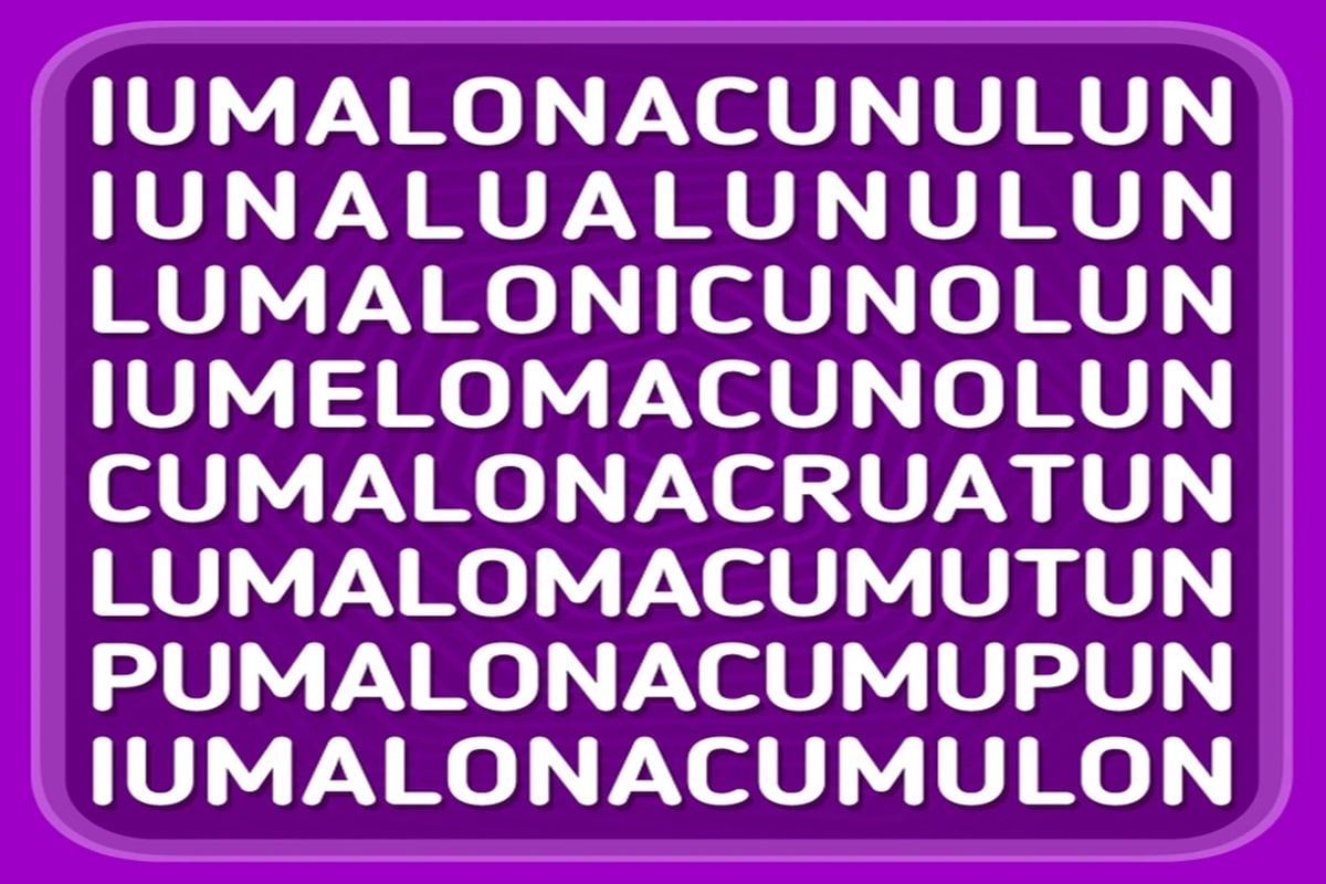 Prepare-se para o desafio de hoje, que vai testar sua percepção! Observe com bastante atenção, a imagem mostra sequências de letras inventadas organizadas em linhas, dispostas sobre um fundo roxo. Você consegue achar as palavras lua e crua em até 20 segundos?