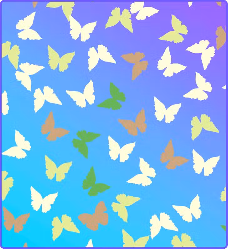 Prepare-se para o desafio de hoje, que vai testar sua percepção! Observe com bastante atenção a imagem colorida com dezenas de borboletas em tons pastel sobre um fundo azul e lilás em degradê.