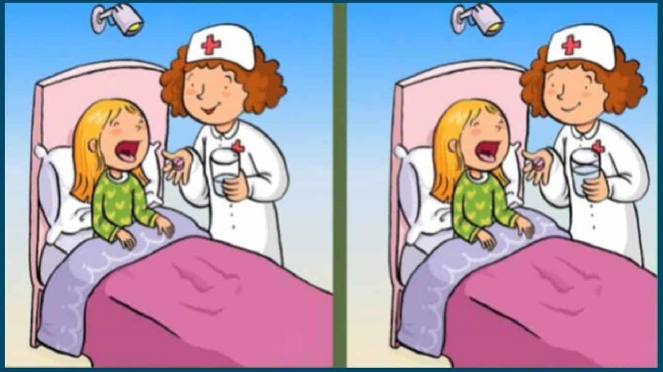 Duas imagens quase idênticas mostram uma enfermeira atendendo uma menina doente. Consegue identificar as diferenças? Imagem: Pinterest