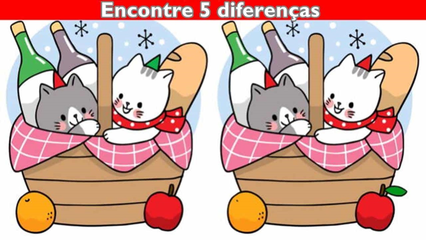 Agora vamos para resolução do desafio visual, na imagem abaixo você irá encontrar onde está localizado as CINCO DIFERENÇAS na imagem representada por duas cestas contendo gatos, garrafas de vinho e baguetes.