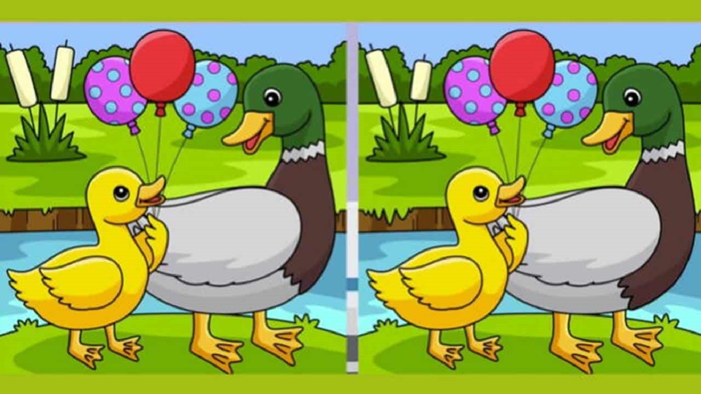 Agora vamos para resolução do desafio visual, na imagem abaixo você irá visualizar onde está localizado as TRÊS DIFERENÇAS na imagem representada por uma ilustração colorida de um pato e um patinho segurando balões, com diferenças sutis entre duas versões da imagem.