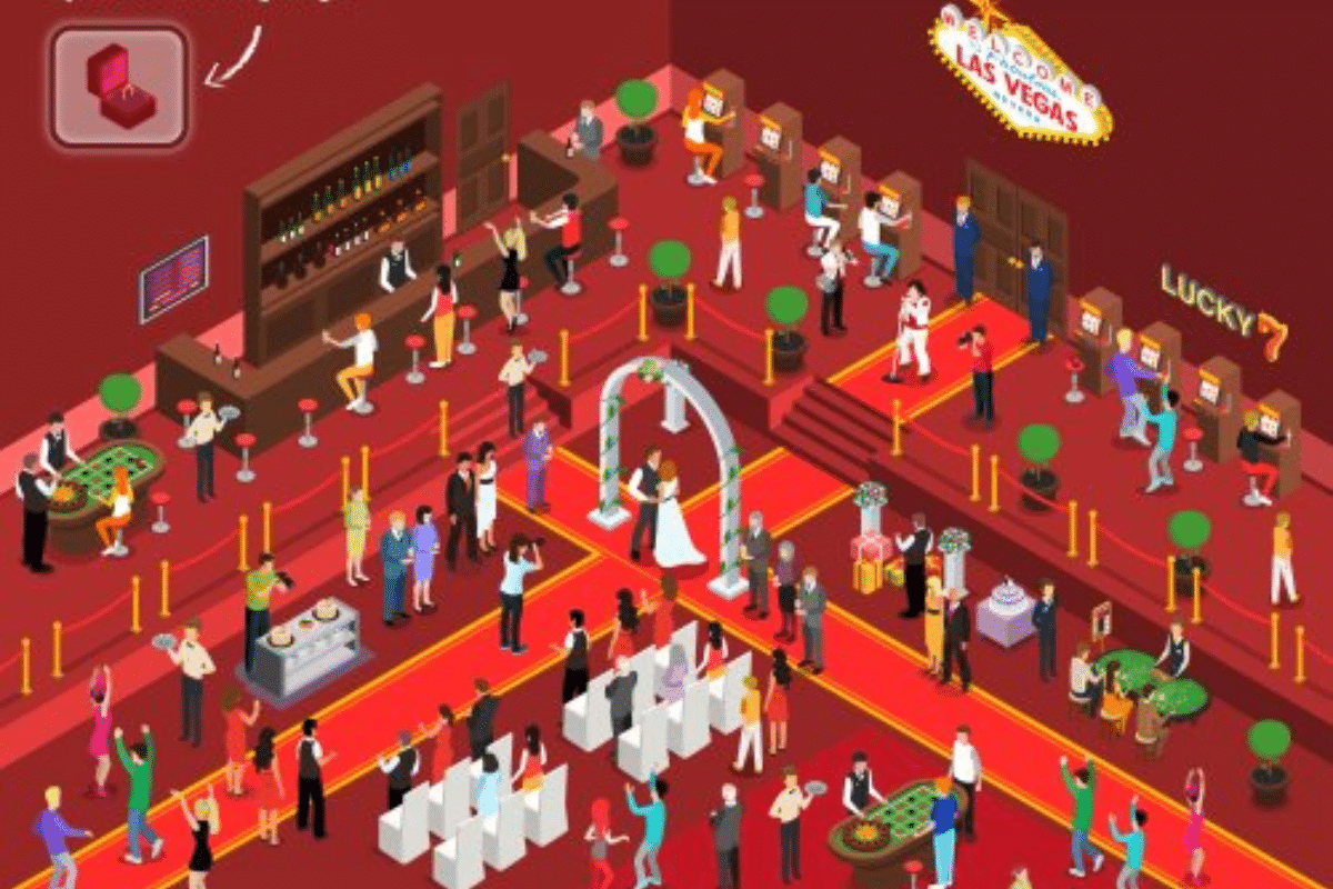 A imagem retrata um ambiente vibrante de um cassino em Las Vegas, onde um casamento está acontecendo no centro da cena. O local está repleto de convidados e jogadores aproveitando as mesas de jogos, um bar movimentado e máquinas caça-níqueis. No alto, um letreiro iluminado com “Welcome to Las Vegas” reforça a atmosfera festiva. Há diversos elementos espalhados pelo salão, como garçons servindo drinks, músicos tocando e turistas tirando fotos.
