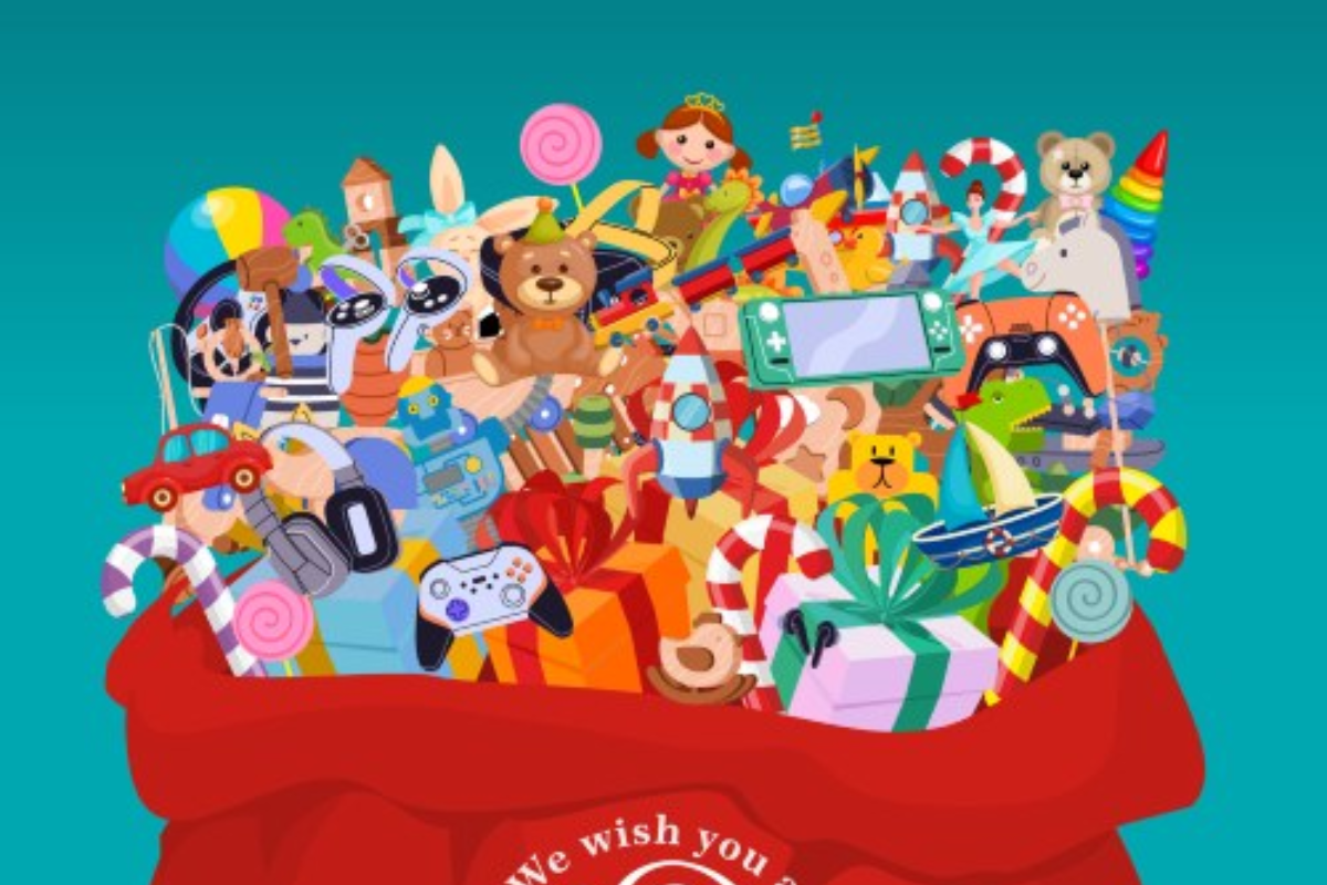 A imagem mostra um grande saco vermelho do Papai Noel, repleto de brinquedos coloridos e presentes de Natal. Entre os itens, é possível identificar carrinhos, ursinhos de pelúcia, bonecas, pirulitos, balões, consoles de videogame e outros objetos divertidos. No entanto, escondida entre todos esses brinquedos, há uma bola de futebol, que se camufla no meio da bagunça.