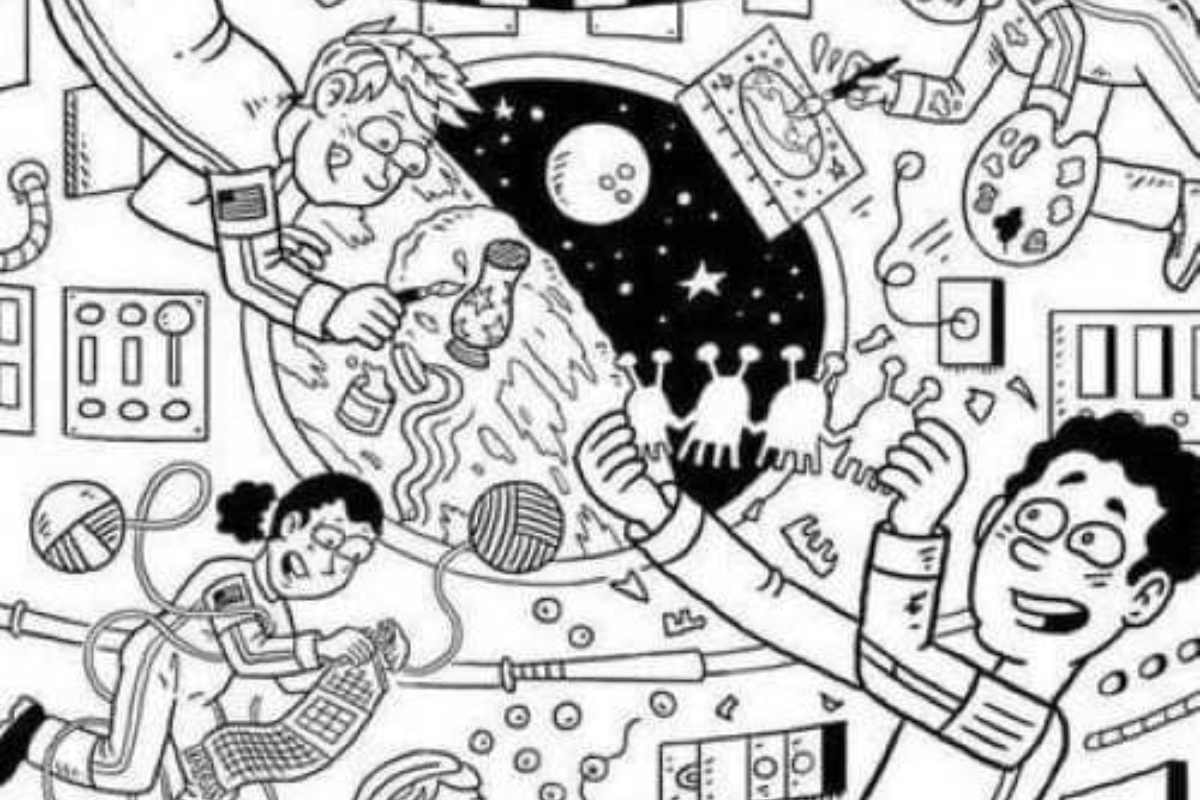 A imagem retrata uma cena movimentada dentro de uma nave espacial durante um evento chamado “Space Craft Night”. Há várias pessoas flutuando em gravidade zero, interagindo com diferentes objetos, como ferramentas, fios e itens relacionados a artesanato. O ambiente é repleto de detalhes: painéis de controle, tubos, botões, e até uma vista do espaço com estrelas e planetas ao fundo.