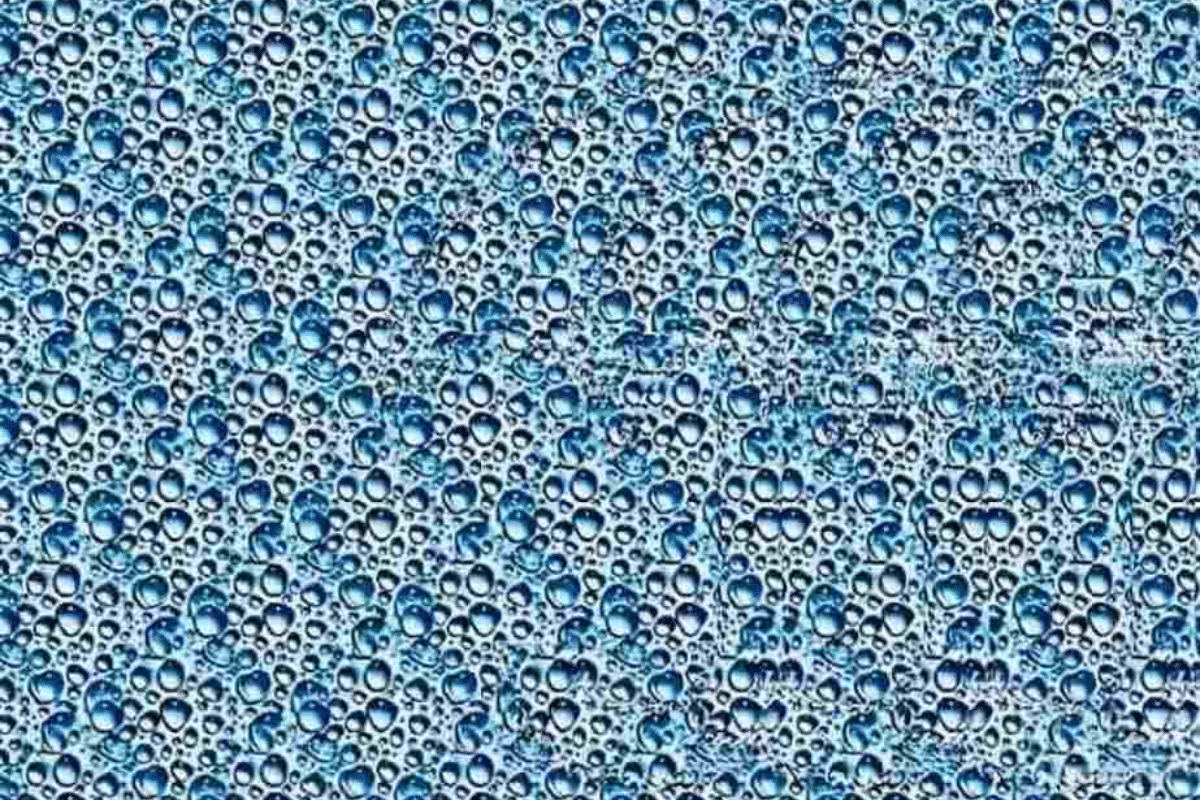 A imagem apresenta um padrão visual repleto de pequenas gotas de água, distribuídas de maneira uniforme por toda a cena. As bolhas brilham com reflexos azulados, criando um efeito tridimensional que pode enganar os olhos e dificultar a identificação de qualquer elemento diferente. No entanto, há um detalhe escondido: uma folha está camuflada entre as gotas.