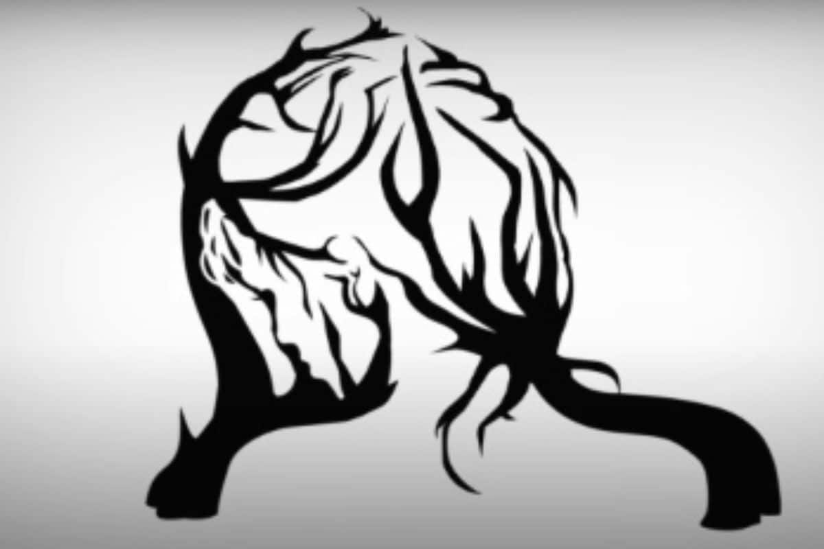 A imagem apresentada é uma ilustração em preto e branco que, à primeira vista, parece ser a composição de duas árvores cujos galhos se entrelaçam. No entanto, escondida nessa cena, está a silhueta de uma mulher. O desafio é encontrar a figura oculta em meio aos galhos e troncos das árvores.