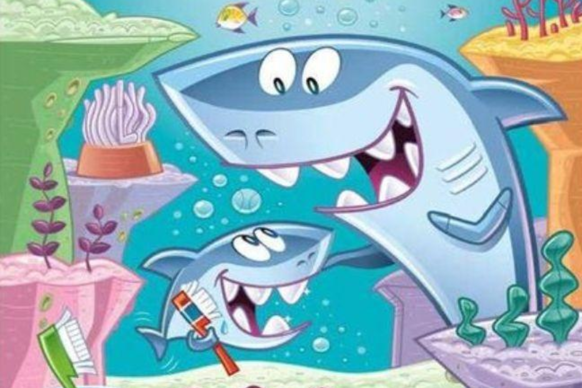 A imagem retrata uma cena subaquática divertida e cheia de detalhes, com dois tubarões sorridentes interagindo em um ambiente que mistura elementos de banheiro com a vida marinha. Ao fundo, há corais, algas e peixes nadando em um fundo azul vibrante. No primeiro plano, vemos itens de higiene pessoal, como uma escova de dentes, creme dental, fio dental, um sabonete e uma torneira de água saindo de uma pia em formato de concha. Todos os objetos estão bem integrados ao ambiente, criando um cenário criativo e animado.