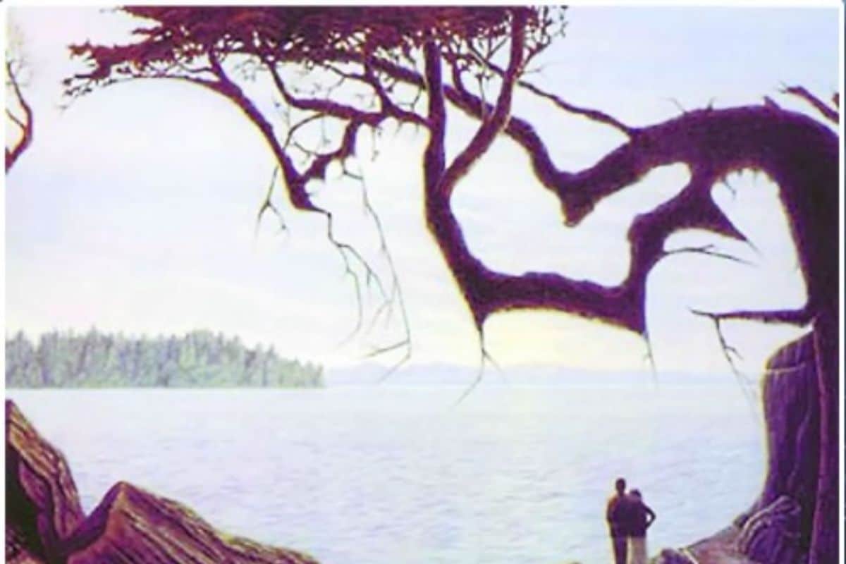 A imagem apresenta uma paisagem serena com árvores de galhos retorcidos enquadrando um cenário de rio ou lago, com uma ilha ao fundo. No primeiro plano, duas figuras humanas estão de costas, contemplando a vista, dando um ar contemplativo à cena. O interessante, no entanto, é que há um bebê escondido de forma criativa nessa composição.