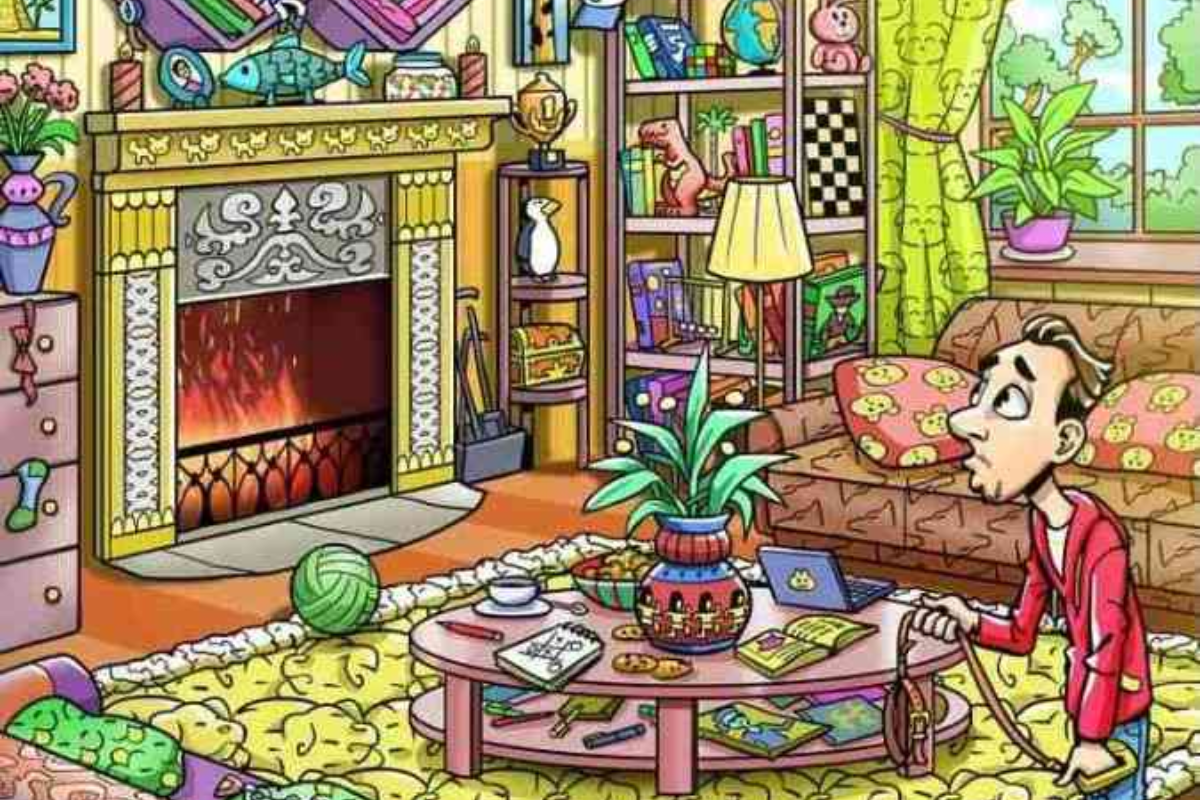 Seu desafio é encontrar o cachorro escondido nessa sala. Olhe com atenção para todos os cantos da imagem. O cachorro não está simplesmente “sumido” — ele está camuflado entre os objetos, e apenas olhos muito atentos conseguirão notá-lo rapidamente.