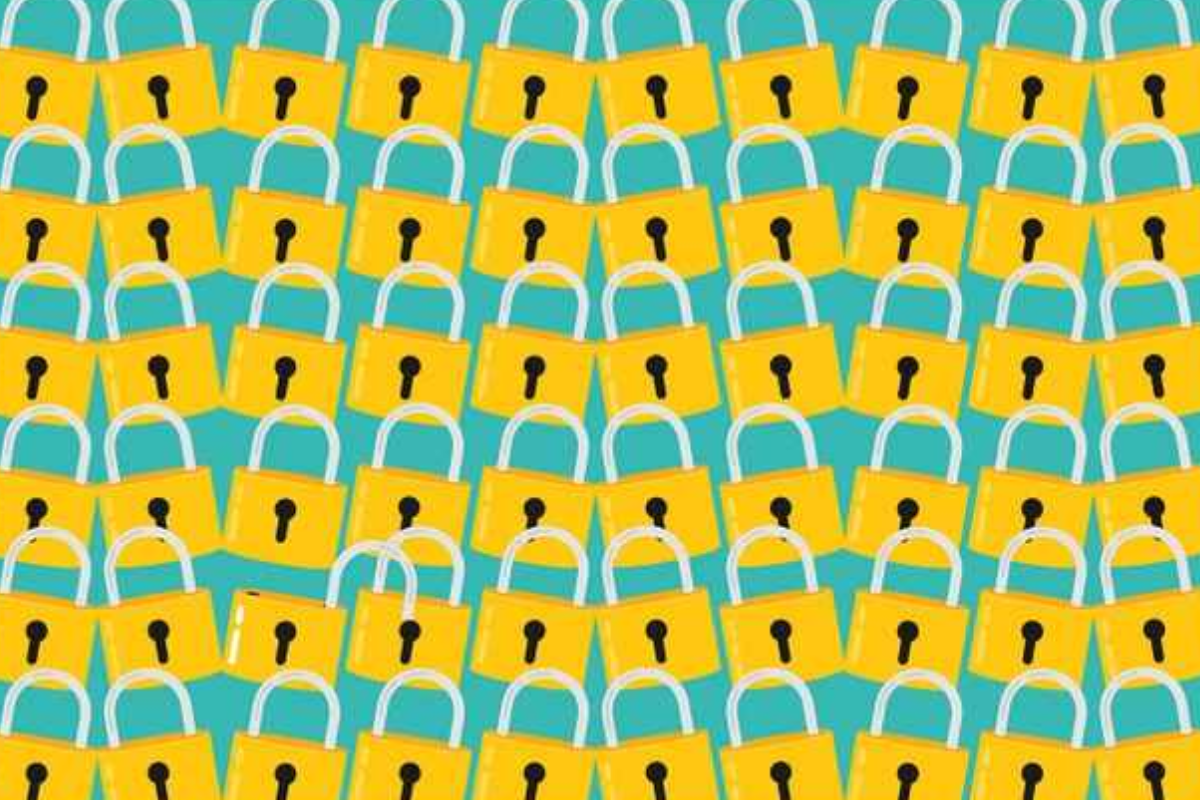 A imagem apresenta um desafio visual com diversos cadeados amarelos organizados em um padrão repetitivo sobre um fundo azul. Os cadeados estão fechados, e cada um tem um fecho curvado e uma parte central com um buraco de chave. Contudo, há uma exceção: um dos cadeados está aberto.