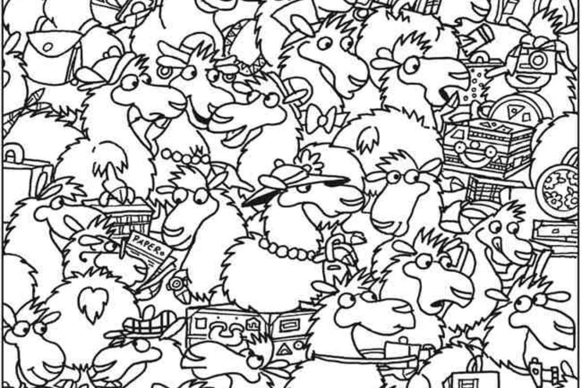 A imagem é um desenho detalhado que retrata um grande grupo de ovelhas em um cenário divertido e cheio de elementos variados, como acessórios e objetos. As ovelhas estão organizadas de maneira que seus rostos e expressões se destacam, criando um mosaico de traços caricatos e bem-humorados. Entre elas, há um desafio: um leão está escondido no meio desse rebanho.