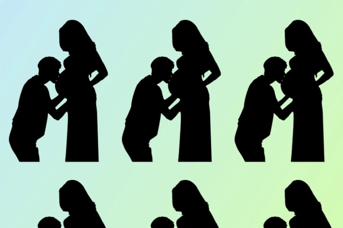 A imagem apresenta seis silhuetas de casais, todos em poses semelhantes: um homem inclinado para a frente, tocando ou falando com a barriga de uma mulher grávida. As silhuetas dos casais estão organizadas em duas fileiras de três, formando um padrão visual repetitivo. Embora à primeira vista todos pareçam iguais, há um detalhe sutil que diferencia um dos casais dos demais.
