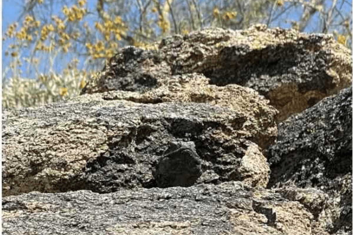 A imagem mostra um conjunto de pedras em um ambiente rochoso e ensolarado, com vegetação seca e céu azul ao fundo. À primeira vista, tudo parece uma paisagem natural comum — mas, entre as fendas e texturas das rochas, está escondido um chuckwalla, um lagarto que se camufla com perfeição nesses ambientes.