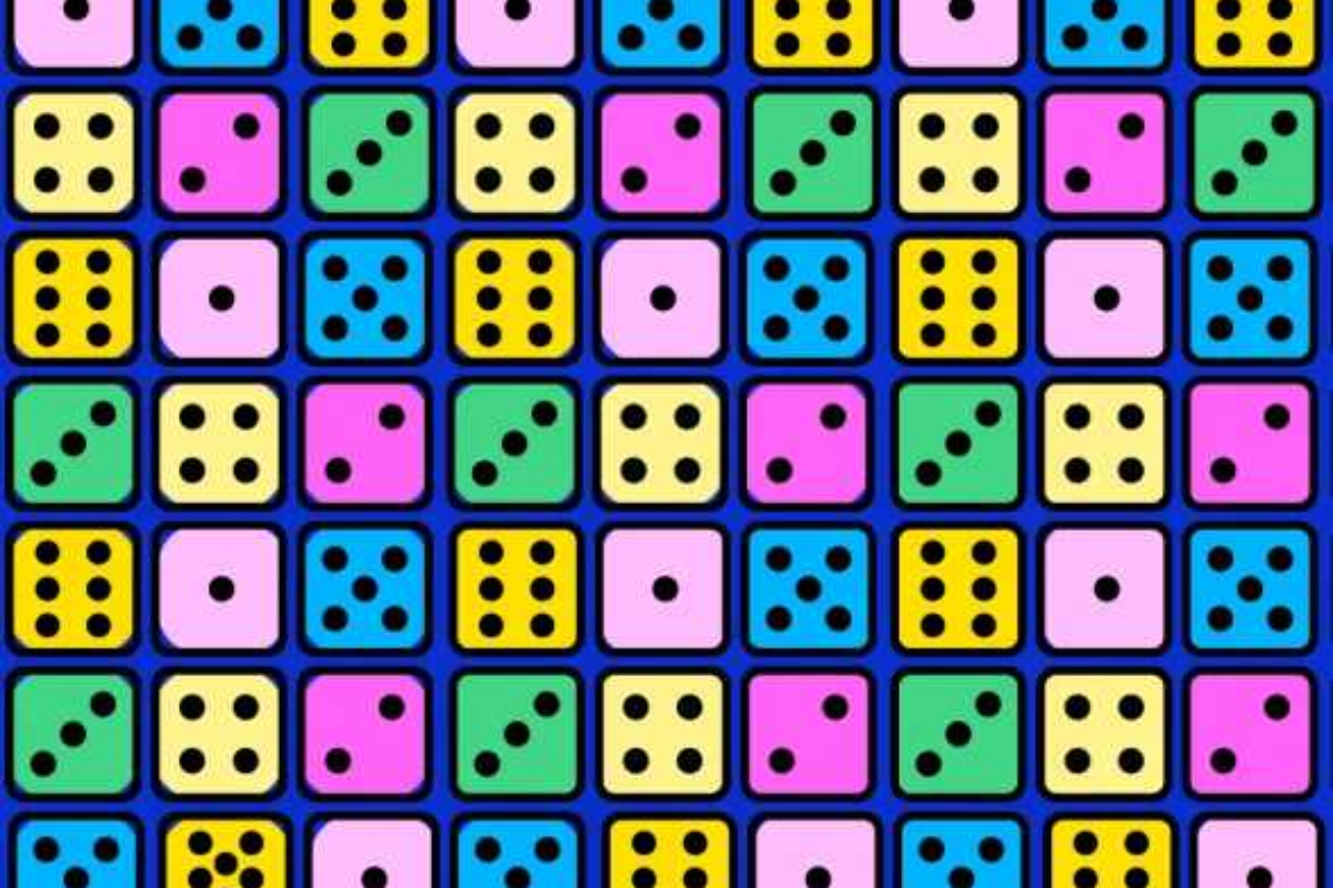 A imagem apresenta uma grade colorida cheia de dados em diferentes cores, incluindo amarelo, rosa, verde e azul. Cada dado contém pontos pretos representando números de 1 a 6, seguindo o padrão tradicional. À primeira vista, todos os dados parecem normais, mas existe um detalhe que os diferencia: um deles é anômalo e não segue o padrão numérico esperado.