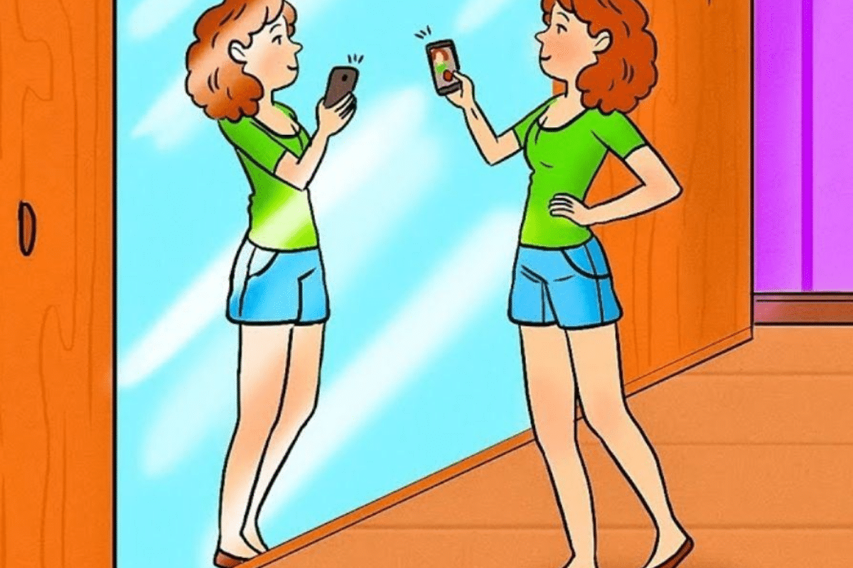 A imagem mostra uma mulher vestindo uma blusa verde e shorts azuis, em pé diante de um grande espelho. Ela segura um celular na mão e observa seu próprio reflexo. No entanto, há algo de errado na imagem. O reflexo no espelho não corresponde exatamente à realidade, criando um efeito estranho e inconsistente.