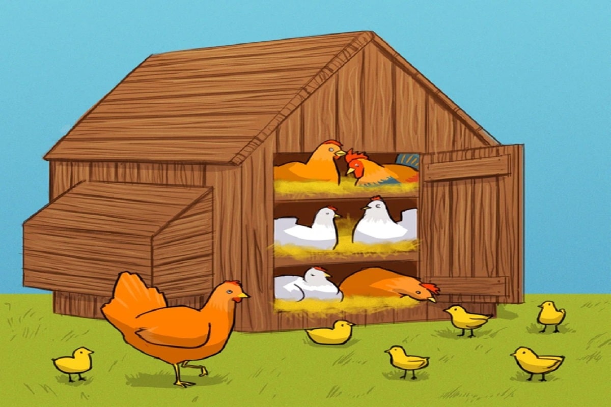 Ache o erro na imagem com as galinhas e pintinhos convivendo juntos em um galinheiro de madeira. Imagem: pixabay