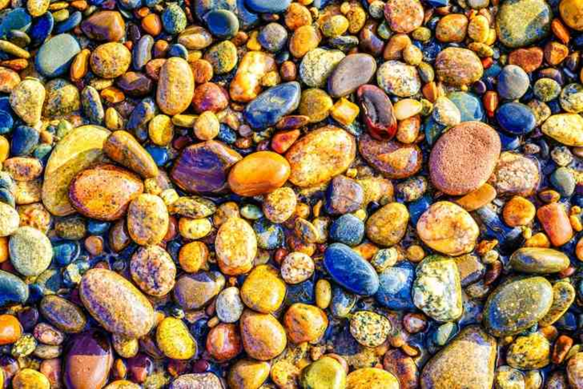 A imagem mostra uma coleção de pedras coloridas e variadas em formas e tamanhos, criando um cenário visual vibrante. Com tons que vão do amarelo ao azul, passando por laranja e marrom, cada pedra parece ter uma textura única, o que torna o desafio ainda mais interessante.