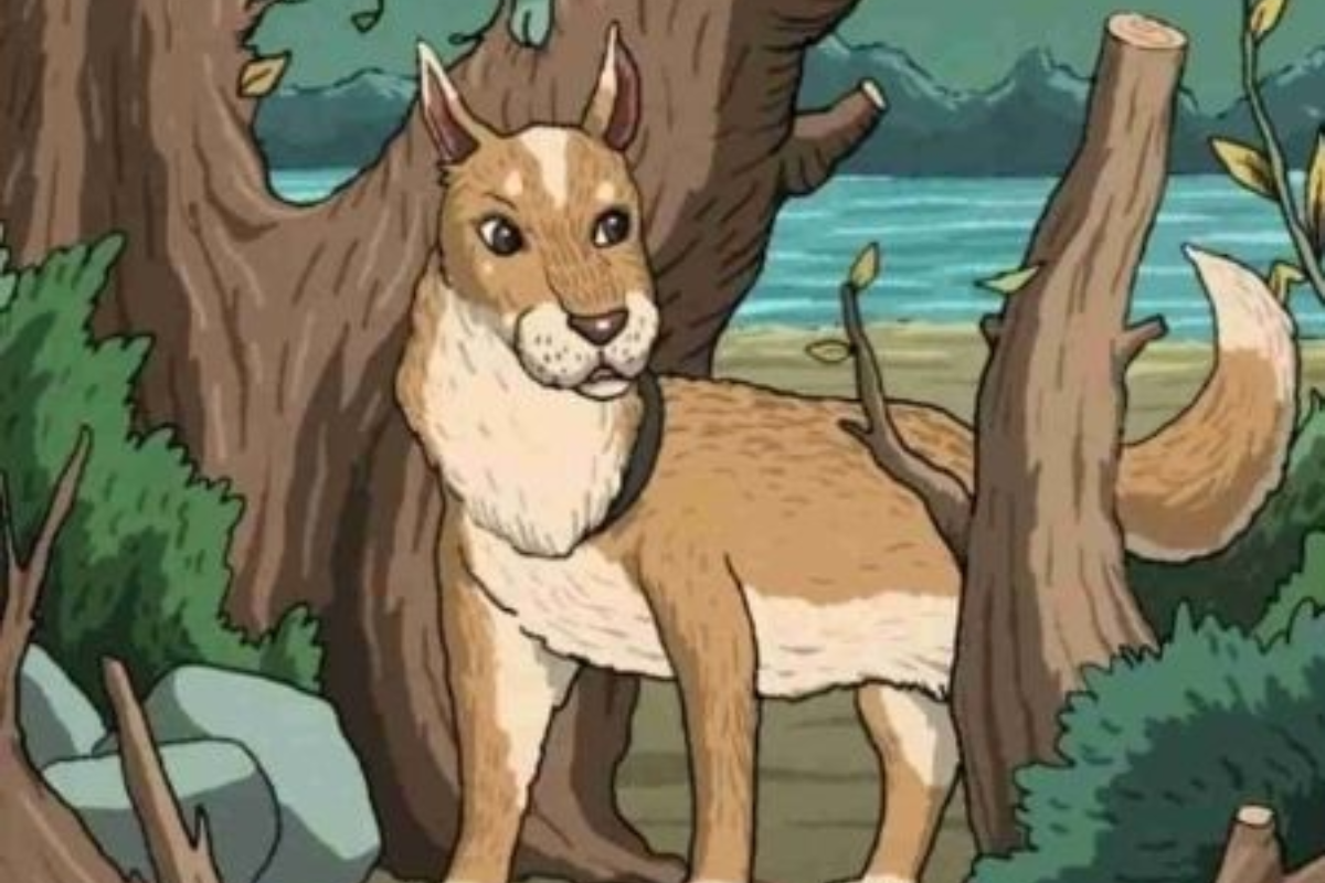 A imagem mostra uma cena natural, com árvores, arbustos e um corpo d’água ao fundo. No centro da imagem, há um animal que, à primeira vista, parece ser um cachorro. No entanto, a ilustração esconde um desafio visual: em algum lugar desta paisagem, há um gato disfarçado entre os detalhes.