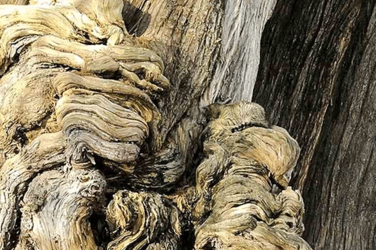 A imagem mostra o tronco de uma árvore antiga, com texturas torcidas e enrugadas que se entrelaçam em padrões naturais impressionantes. A madeira apresenta curvas orgânicas que imitam formas vivas — e é justamente isso que torna o desafio mais difícil.