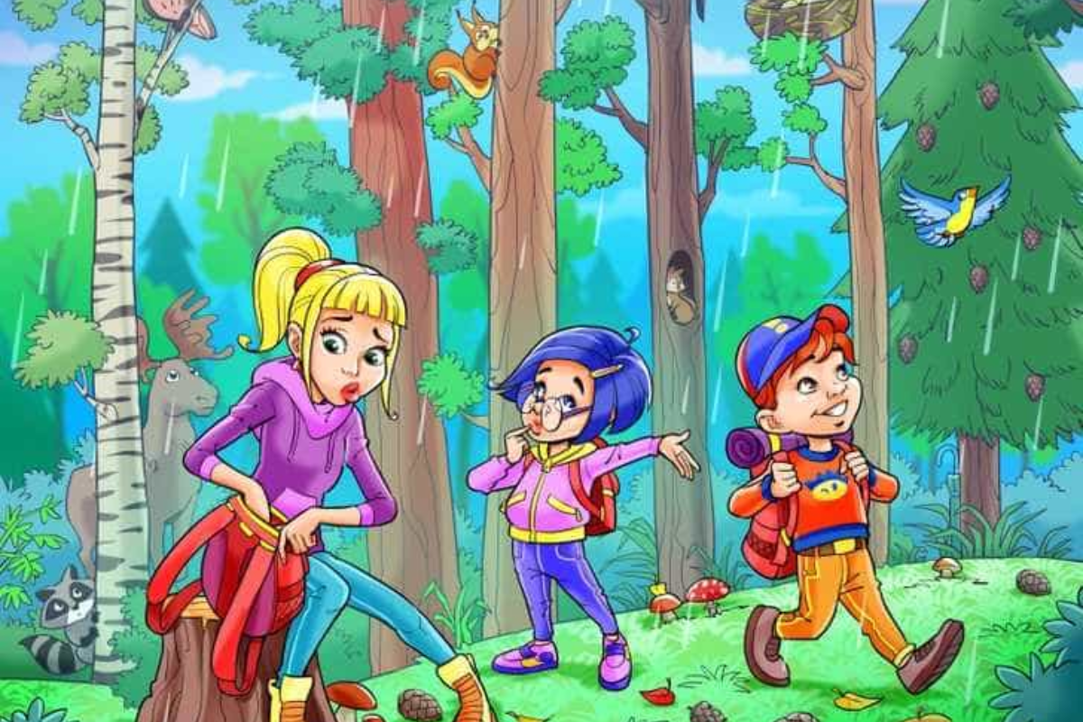 A imagem mostra uma cena vibrante e colorida de uma floresta onde três crianças parecem estar em uma caminhada. À esquerda, uma garota loira com rabo de cavalo está usando um moletom roxo e calças azuis. Ela parece surpresa, ajustando algo em sua cintura. No centro, outra menina, com cabelo azul escuro e óculos, também está vestida de roxo e carrega uma mochila vermelha. Ela parece estar gesticulando para a garota loira. À direita, um menino de cabelo ruivo, usando boné azul e uma jaqueta amarela, carrega uma mochila e está sorrindo, olhando para as outras duas meninas.