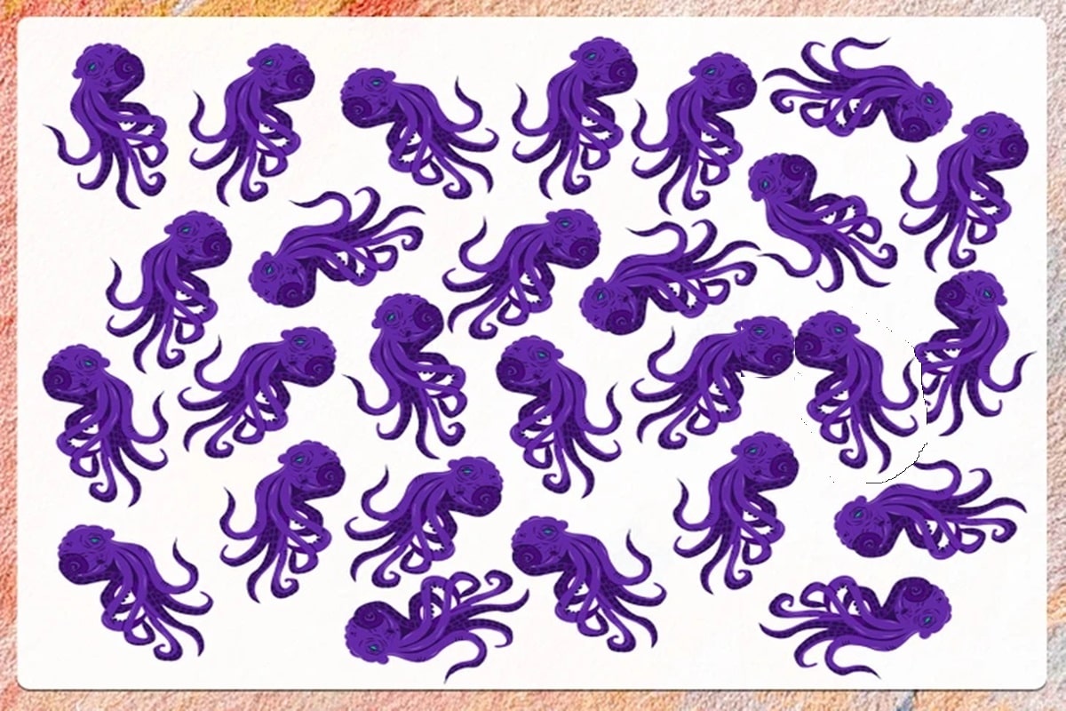 Prepare-se para o desafio de hoje, que vai testar sua percepção! Observe com bastante atenção, a imagem mostra vários polvos roxos ilustrados em diferentes posições sobre um fundo branco.