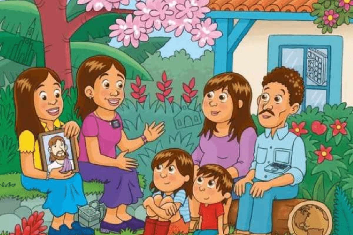 A imagem retrata uma cena familiar ao ar livre, onde um grupo de pessoas está sentado em um jardim. Há flores coloridas espalhadas pelo chão, um belo céu azul, uma árvore florida e uma casa ao fundo. O ambiente transmite tranquilidade e alegria, com todos interagindo e compartilhando um momento juntos.