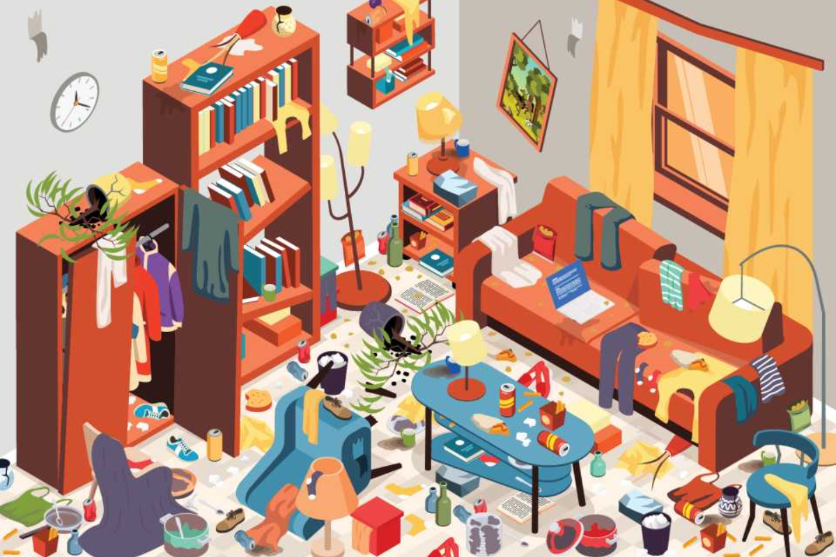 A imagem mostra uma sala cheia de objetos espalhados por todos os lados, criando uma cena de grande desordem. Há roupas, livros, papéis, latas, pratos e vários outros itens distribuídos no chão, sofá e estantes. A cena inclui elementos como uma mesa de centro com diversos objetos sobre ela, uma estante cheia de livros, um sofá com roupas e até plantas caídas, dando a impressão de um ambiente bastante desorganizado.