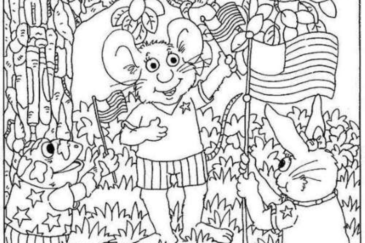 Na imagem, vemos um cenário de “Flag Day” onde animais estão reunidos em uma celebração. Ao centro, um rato de grandes orelhas está vestindo uma camisa com uma estrela e shorts listrados, segurando uma bandeira dos Estados Unidos. À sua direita, um coelho também está segurando uma bandeira e usando uma camisa com estrela. À esquerda, um sapo igualmente vestido de forma patriótica segura outra bandeira, todos juntos comemorando em meio a árvores e arbustos.