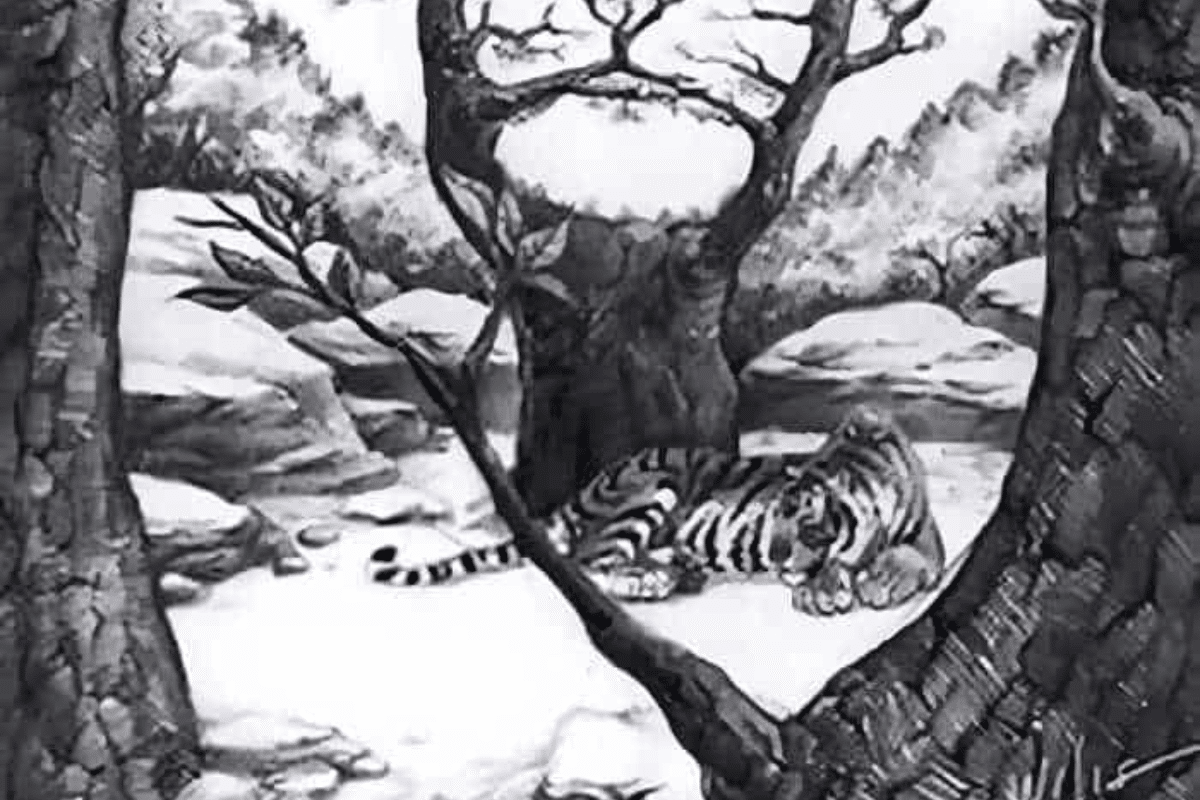 A imagem deste desafio é uma ilustração em preto e branco de uma floresta, repleta de árvores com troncos grossos, galhos retorcidos e folhas espalhadas. No canto inferior direito, há um tigre real claramente visível, deitado sob uma árvore, descansando. No entanto, o verdadeiro desafio está em encontrar um segundo tigre escondido na imagem.