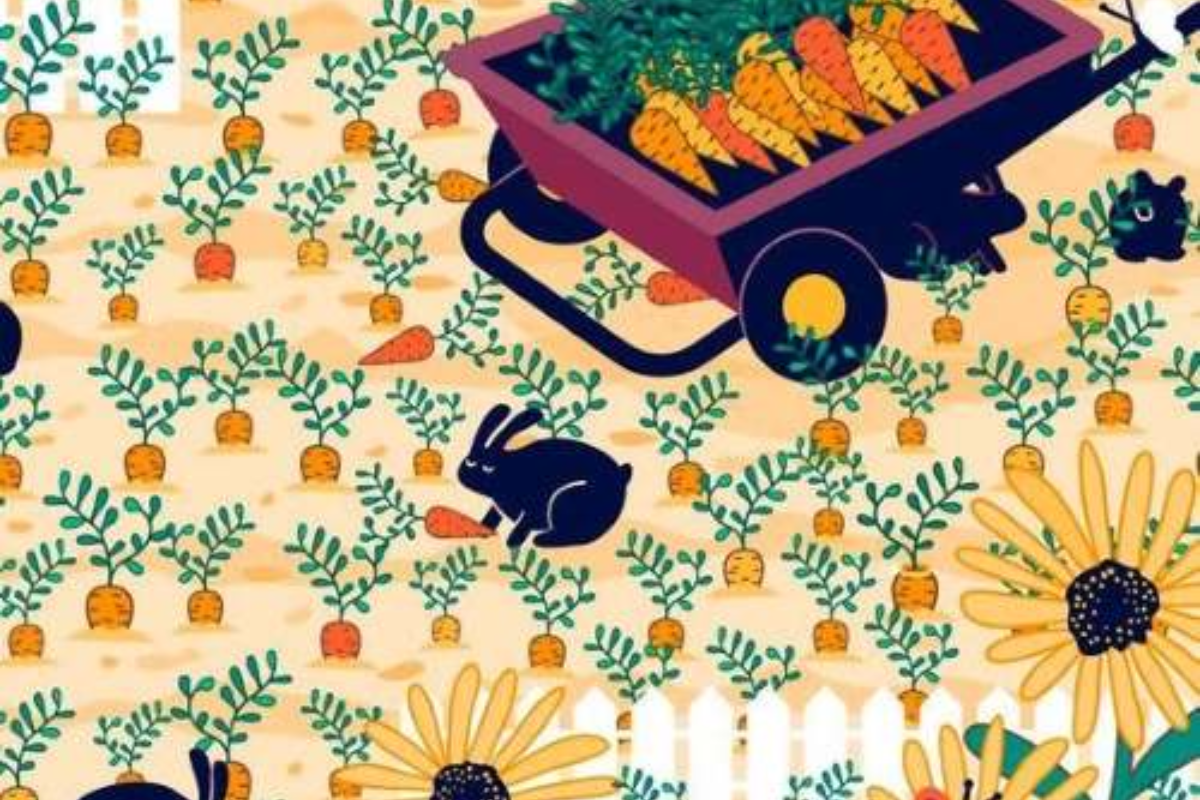 A imagem mostra um cenário de jardim repleto de detalhes vibrantes: há uma carriola cheia de cenouras, flores amarelas grandes e vários coelhos pretos espalhados pelo campo. Além disso, o fundo está repleto de pequenos desenhos de cenouras e plantas, criando uma textura densa e colorida.