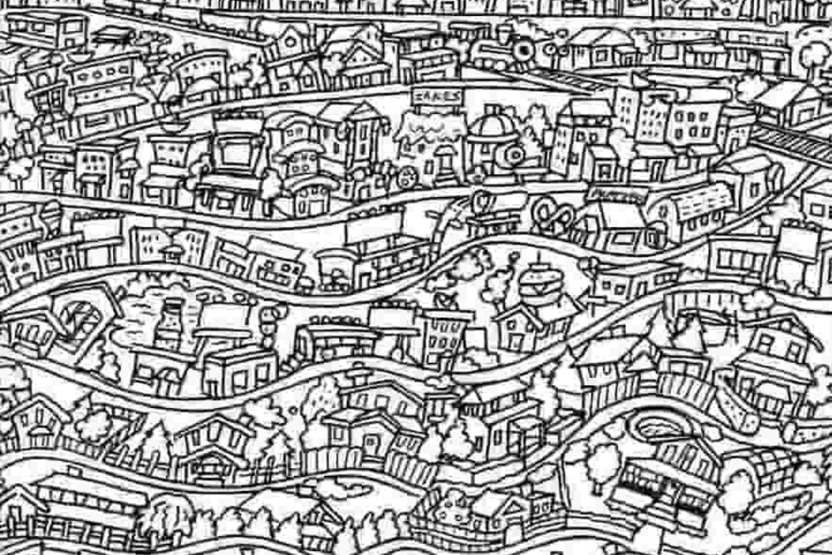 A imagem apresenta uma cidade em estilo de ilustração cheia de detalhes, com várias construções, casas, árvores e elementos urbanos organizados em camadas, dando a sensação de profundidade e complexidade. Há diversos edifícios, ruas sinuosas, cercas e árvores espalhados por toda a área, o que torna o cenário bastante detalhado e visualmente desafiador.