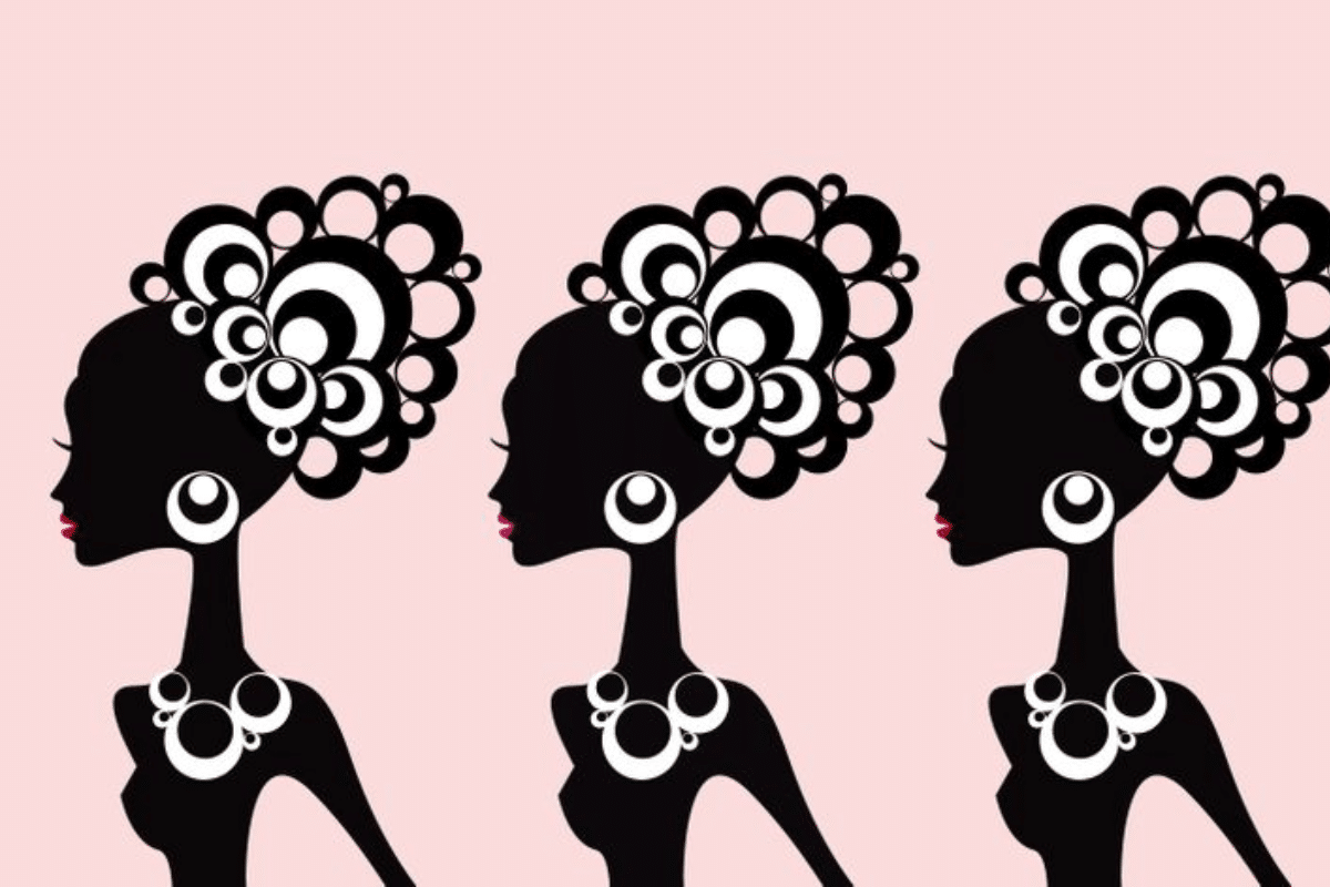 A imagem mostra três figuras de mulheres em silhueta, cada uma com um elaborado penteado e acessórios em forma de círculos, criando um padrão simétrico. As mulheres estão desenhadas com um estilo gráfico simples e elegante, com detalhes em branco e preto, contrastando com o fundo rosa claro.