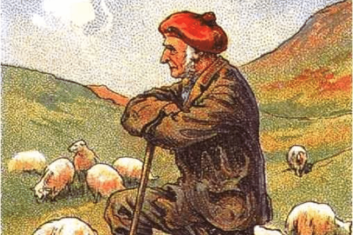 A imagem retrata um pastor idoso, vestindo roupas rústicas e um gorro vermelho, apoiado em seu cajado enquanto observa seu rebanho de ovelhas em uma paisagem montanhosa. O ambiente transmite tranquilidade e parece ser um campo aberto, cercado por vegetação e colinas ao fundo.