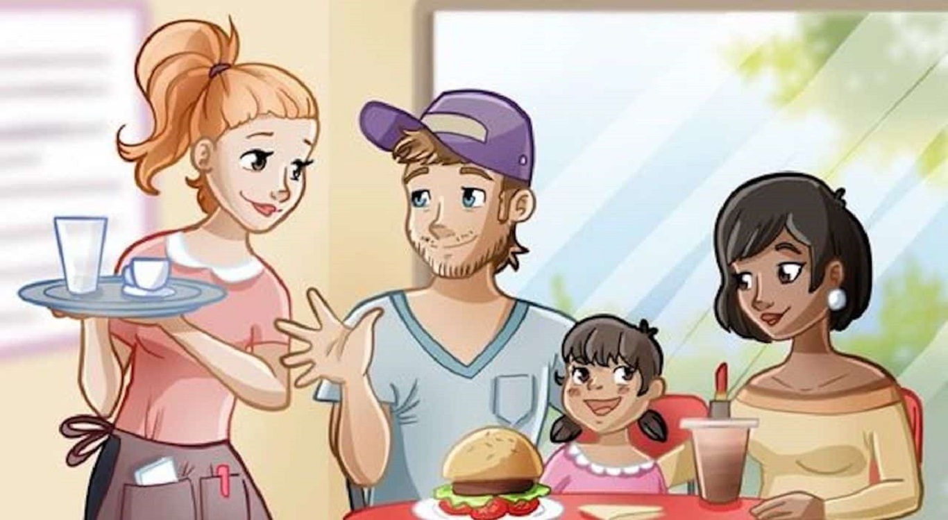 Agora vamos para resolução do desafio visual, na imagem abaixo você irá encontrar onde está localizado os 3 ERROS na imagem de um almoço em família com o atendimento de uma garçonete.