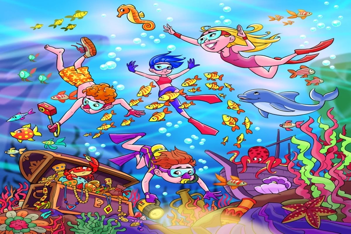Prepare-se para o desafio de hoje, que vai testar sua percepção! Observe com bastante atenção, a imagem mostra uma ilustração de crianças mergulhando com peixes, golfinho, polvo, baú do tesouro e recifes coloridos. Você consegue achar o calçado escondido nesta imagem em até 20 segundos?