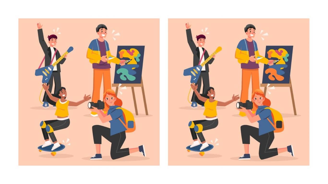 Esse desafio visual não apenas desafia a atenção aos detalhes, mas também celebra a diversidade de talentos e interesses. Na ilustração, os jovens estão imersos em atividades artísticas e esportivas, como tocar instrumentos, pintar, e dançar, criando um cenário dinâmico. Com 25 segundos disponíveis, identificar as 12 diferenças exige não apenas concentração, mas também a habilidade de observar minúcias que podem estar escondidas nas interações entre os personagens ou nos elementos do ambiente. É uma experiência que combina diversão e estimulação mental de maneira única!