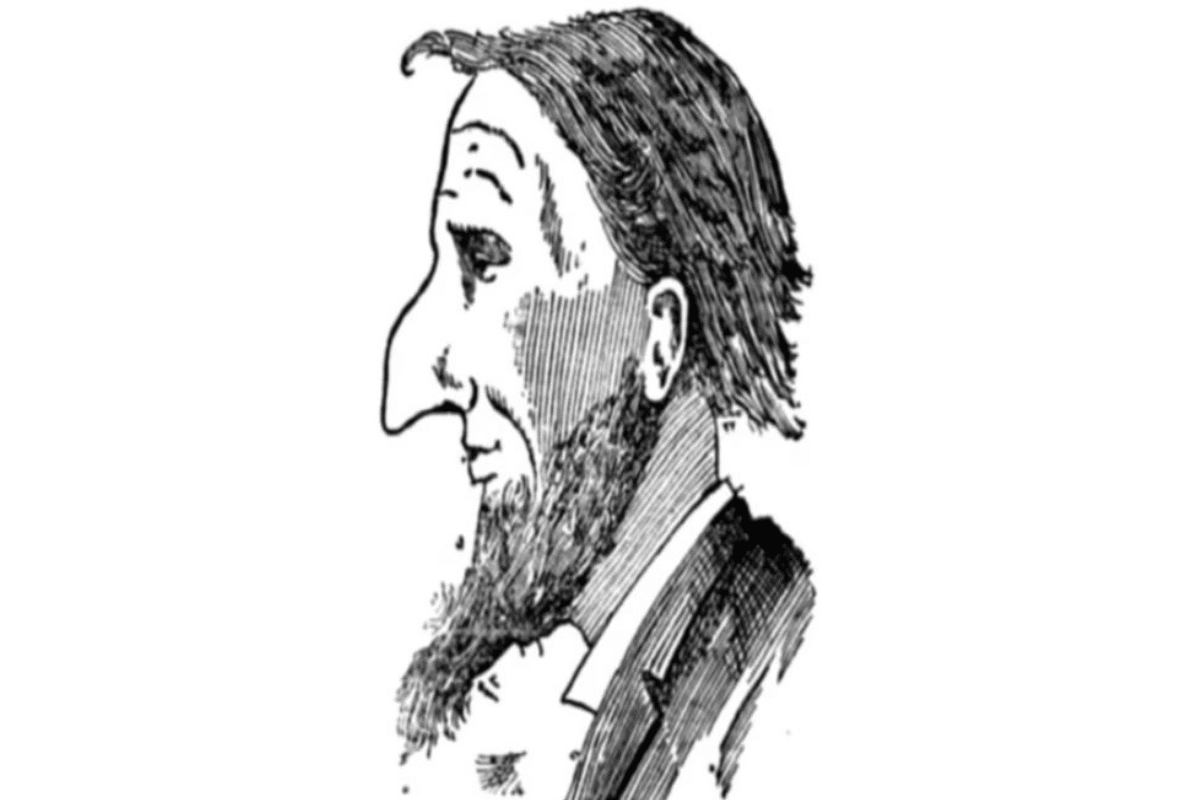 A imagem apresenta um desenho em preto e branco de um homem de perfil, com traços marcantes. Ele tem um nariz grande e pontudo, barba cheia, cabelo penteado para trás e veste um paletó. Seu olhar é calmo e sua expressão transmite seriedade. A técnica usada na ilustração emprega linhas detalhadas para criar textura e profundidade, especialmente na barba e no cabelo.