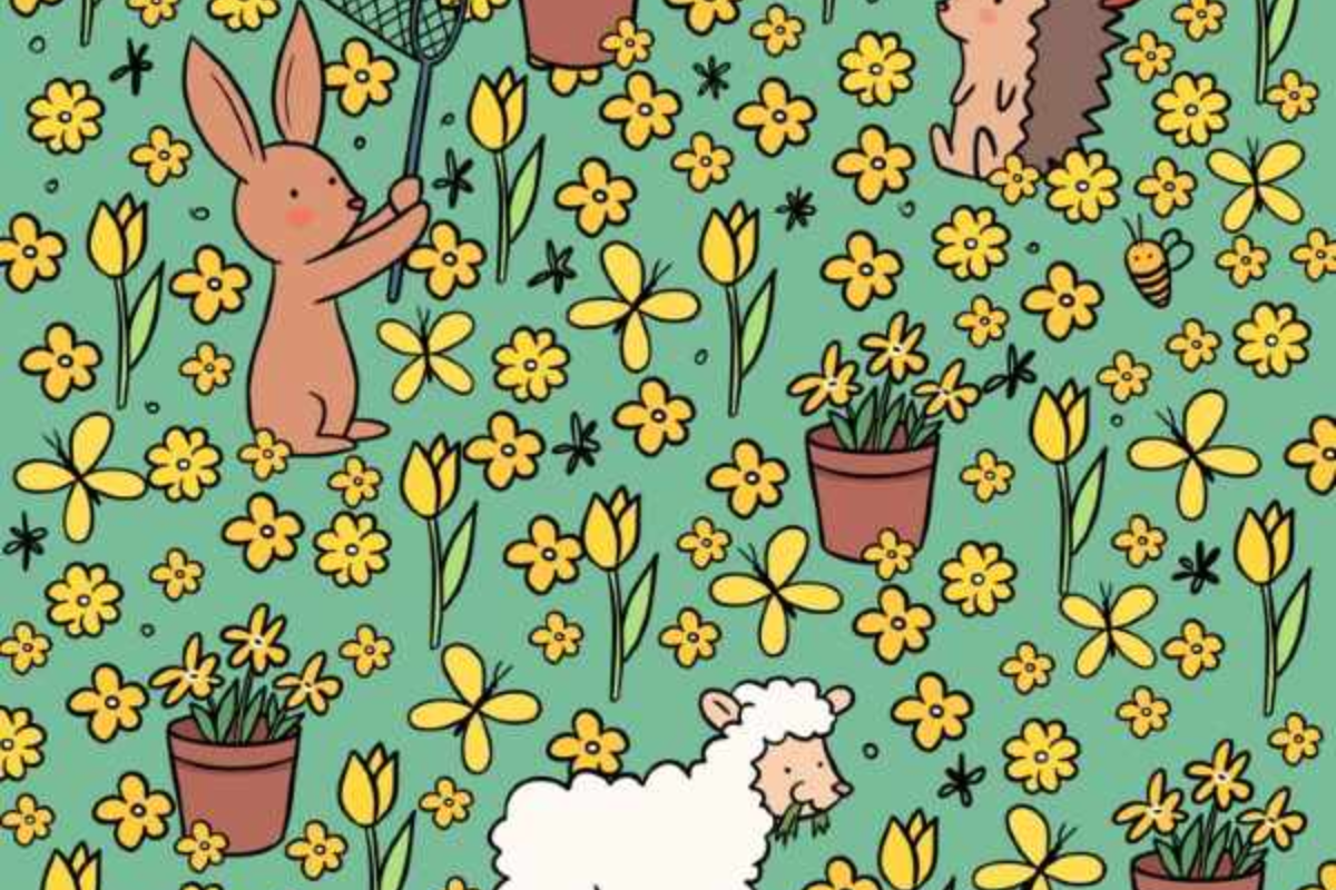 A imagem mostra um cenário colorido e encantador repleto de flores amarelas e folhas verdes que formam um campo vibrante. Entre as flores, há personagens adoráveis, como um coelho segurando uma rede, um ouriço com um chapéu e uma ovelha branca passeando pelo campo. Vasos de flores estão espalhados pela cena, acrescentando mais elementos ao cenário.