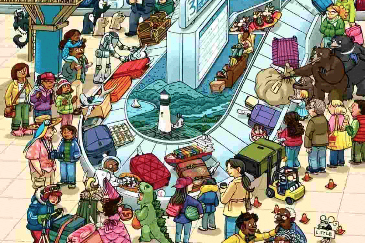 A imagem mostra uma cena caótica e divertida de um aeroporto repleto de elementos inusitados. Ao redor da esteira de bagagens, há crianças fantasiadas, animais como ursos e macacos, robôs, brinquedos, e até personagens fantásticos, todos misturados com passageiros comuns. Malas coloridas, pacotes curiosos e até uma miniatura de farol compõem o cenário.