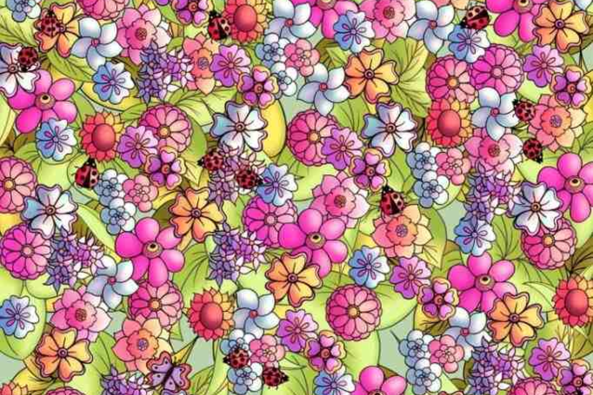 A imagem apresenta um padrão vibrante e detalhado de flores coloridas em tons de rosa, roxo, amarelo e laranja, misturadas com folhas verdes. Entre os elementos florais, pequenos insetos como joaninhas também estão espalhados pela cena, tornando a busca ainda mais desafiadora.