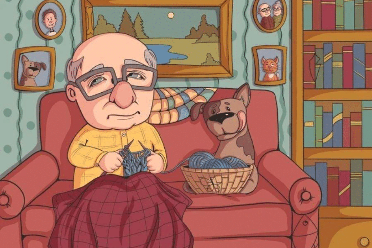 A imagem retrata uma cena aconchegante em uma sala de estar. Um homem idoso de óculos está sentado em uma poltrona vermelha, tricotando com fios de lã azul. Ao seu lado, um cachorro sorridente descansa próximo a um cesto de lã. O ambiente está decorado com uma estante cheia de livros, quadros na parede com fotos de familiares e animais de estimação, e uma janela ao fundo, que revela uma paisagem tranquila com um lago e árvores sob um céu noturno.