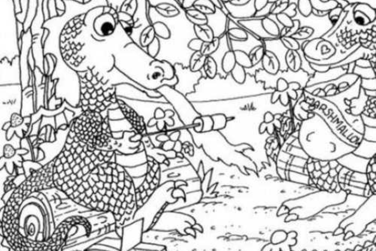 A imagem mostra dois simpáticos dinossauros, sentados ao ar livre, aproveitando um momento juntos. Um deles está assando marshmallows em um espeto, e há uma caixa de biscoitos no chão. A cena é rodeada por árvores e arbustos, com muitos detalhes que chamam a atenção, como folhas, galhos e texturas no corpo dos dinossauros. A ilustração é repleta de pequenos elementos que se misturam, criando o ambiente perfeito para um jogo de “procure e encontre”.