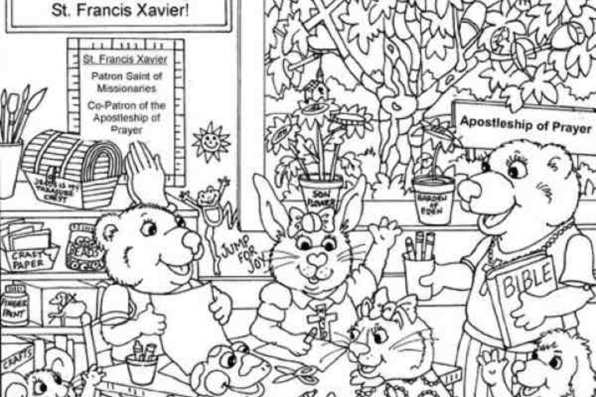 A imagem é cheia de detalhes, desde cestos com materiais de artesanato até quadros com frases motivacionais, como “Saint for the Day: St. Francis Xavier”. Isso cria uma atmosfera lúdica e educativa.