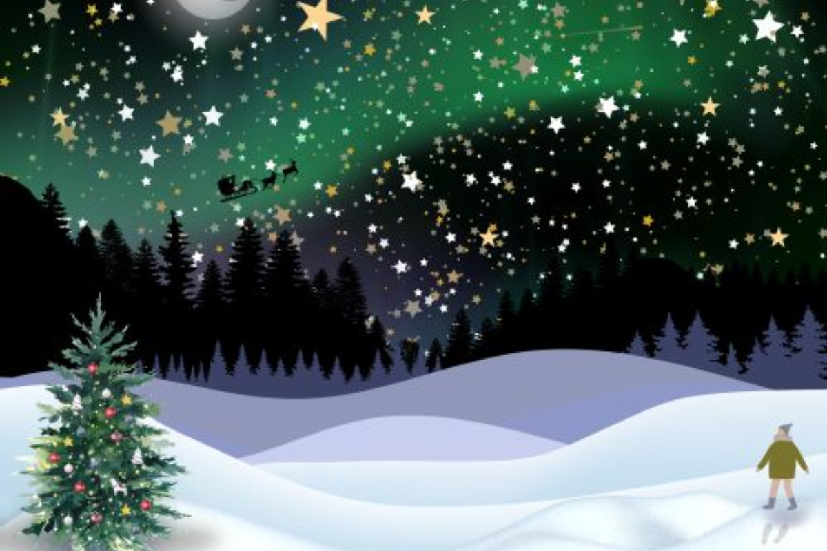 A imagem mostra uma bela paisagem de inverno com neve cobrindo o solo, um céu estrelado iluminado pela Aurora Boreal e uma lua brilhante no canto superior esquerdo. Ao fundo, silhuetas de pinheiros escuros se destacam, enquanto um homem caminha pela neve, deixando rastros atrás de si. Um pinheiro decorado com luzes natalinas embeleza o canto esquerdo, adicionando um clima festivo à cena.