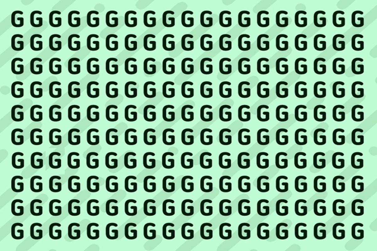 Esta imagem propõe um desafio visual, onde dezenas de letras G estão distribuídas uniformemente sobre um fundo verde-claro. O objetivo é encontrar a única letra diferente disfarçada entre os Gs. Você terá no máximo 20 segundos para terminar esta tarefa.