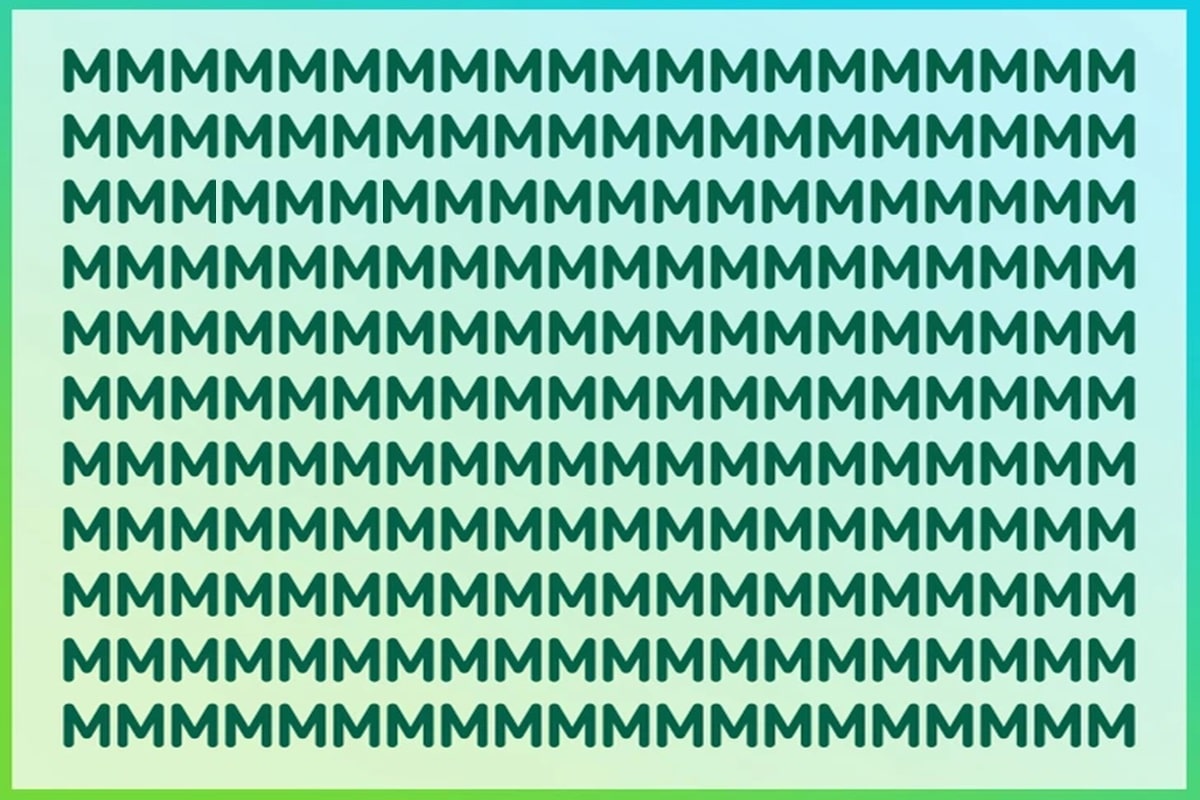 Prepare-se para o desafio de hoje, que vai testar sua percepção! Analise a imagem que apresenta uma série de letras M, todas as maiúsculas, repetidas em linhas retas, formando um padrão visual uniforme. O fundo é verde, destacando as letras em tom verde mais escuro. Será que você consegue achar a letra N em até 30 segundos?