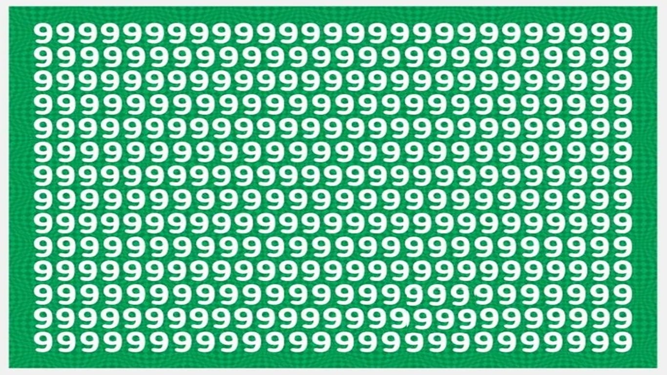 Desafio visual com uma série de números 9 dispostos de forma ordenada em um fundo verde, com uma letra P oculta entre eles